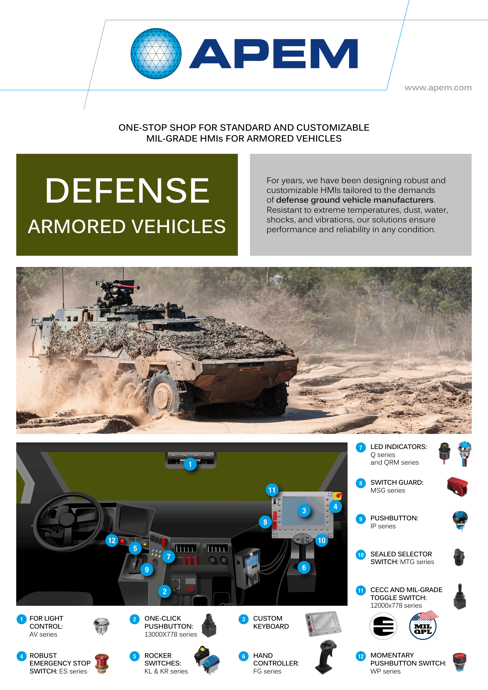 APEM has more than 70 years of experience in the defense industry. Explore in this brochure our broad range of customizable MIL-grade and CECC-certified HMI solutions, including control panels, joysticks, pushbuttons, toggle switches & LED indicators for military ground equipment applications.