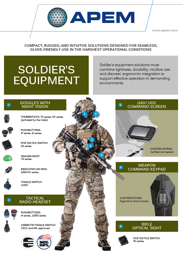 APEM has more than 70 years of experience in the defense industry. Explore in this brochure our broad range of customizable MIL-grade and CECC-certified HMI solutions, including control panels, joysticks, pushbuttons, toggle switches & LED indicators for military ground equipment applications.